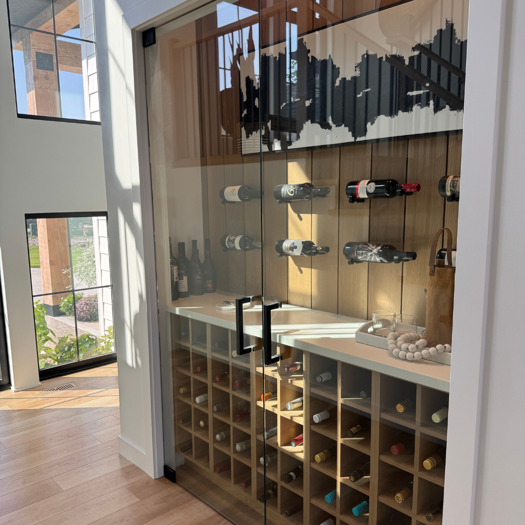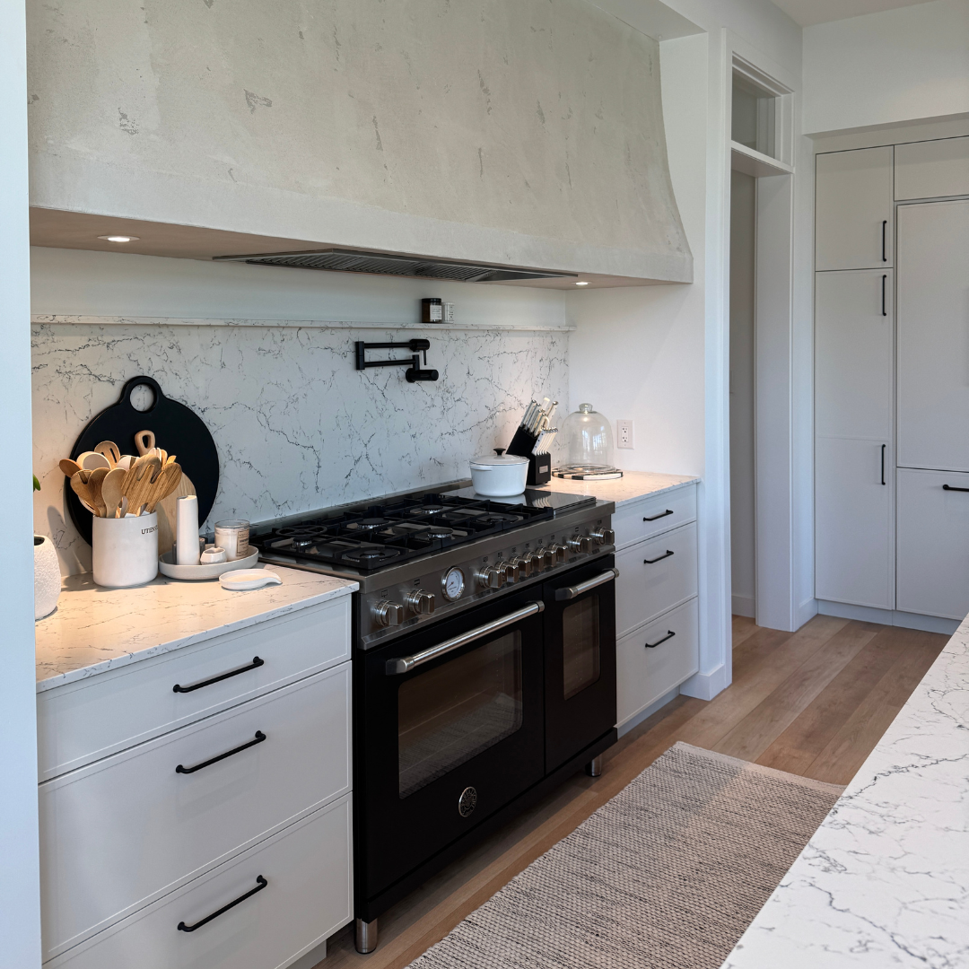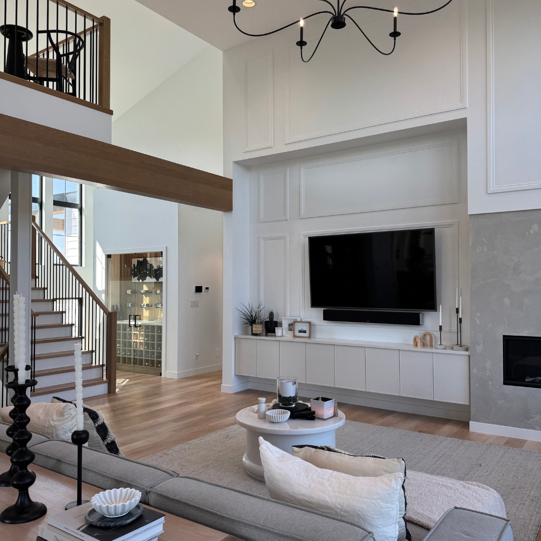 The Scandinavian-inspired home features expansive windows that flood the grand living room with natural light, highlighting a striking fireplace wall with custom millwork. White oak accents throughout add warmth and texture, while a custom plaster hood fan anchors the kitchen with understated elegance. Curated lighting selections enhance each space, and thoughtfully designed cabinetry and tailored details create a cohesive aesthetic rich in character and personality. Its artful interior was recently on display in the Winnipeg Art Gallery’s Home Tour.