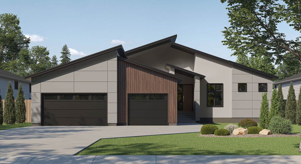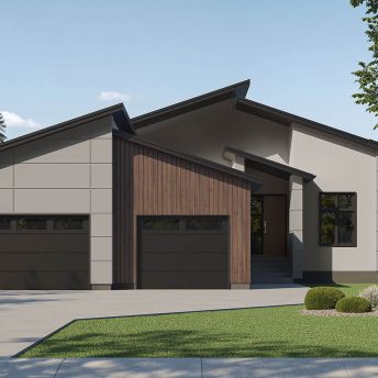 This modern Showhome features a striking exterior of crisp white stucco, smooth concrete panels, and warm wood-look vertical siding. Inside, vaulted ceilings and large windows flood the home with natural light, highlighting the rich hardwood floors and dark, refined accents. Thoughtful wood touches are woven throughout the interior, adding warmth and texture to the sleek, modern design.