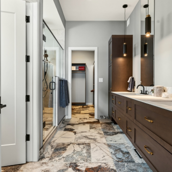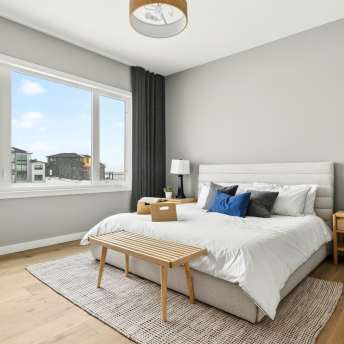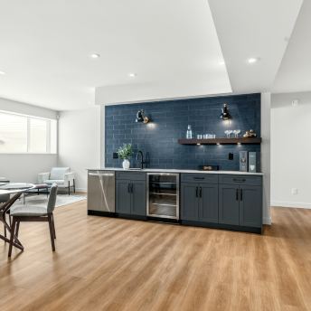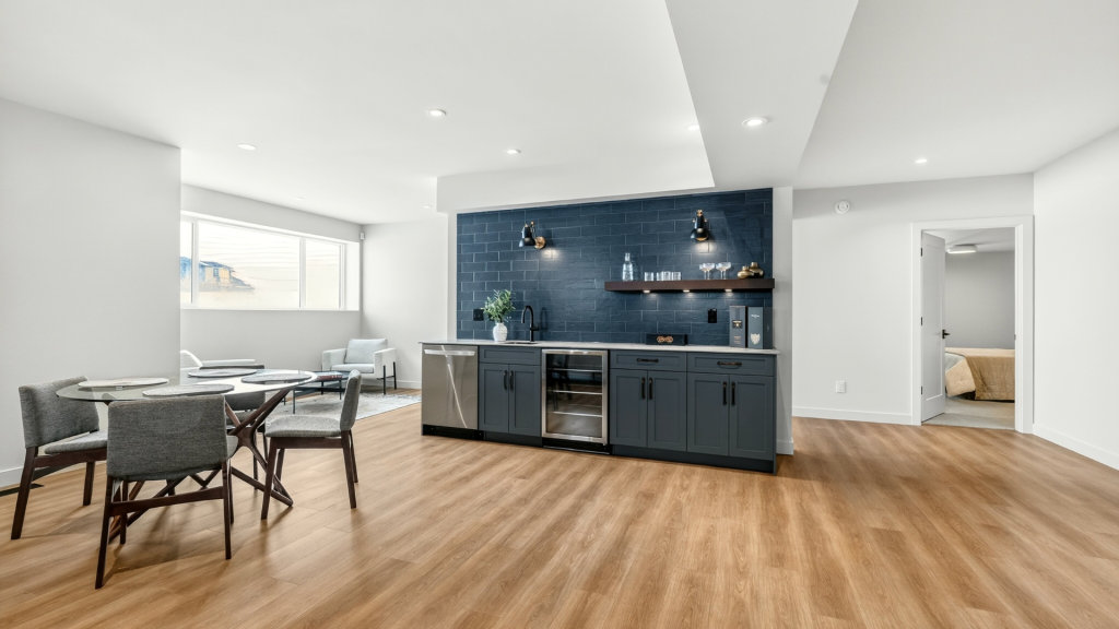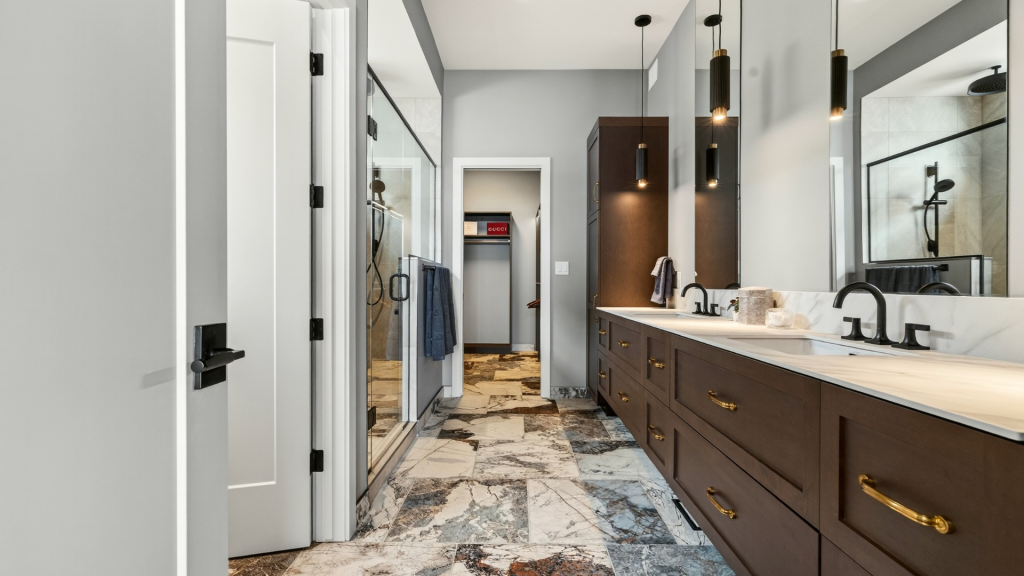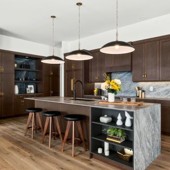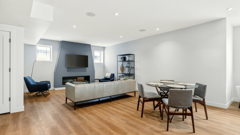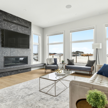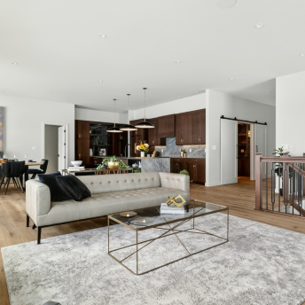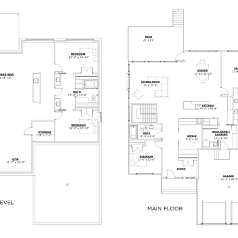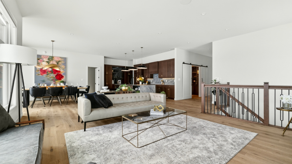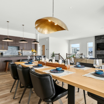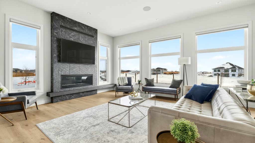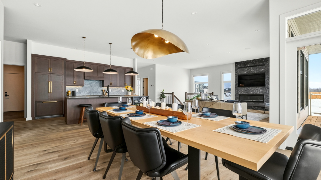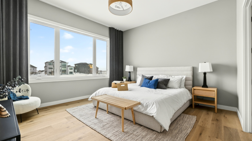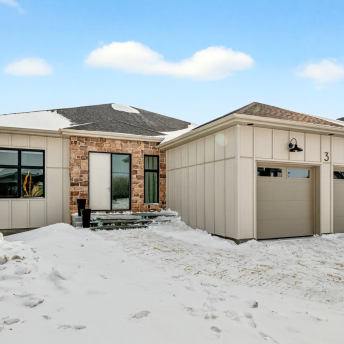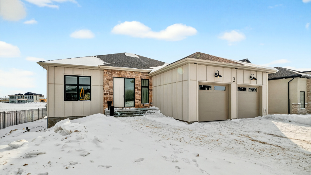 This 2083 Sq. Ft. bungalow features a mix of vertical siding, board and batten, and stone accents on the exterior, with large front windows. The home offers a spacious, open-concept layout with transitional finishes—combining classic and contemporary elements. Neutral tones, clean lines, and elegant fixtures create a warm, timeless interior, with features like porcelain countertops, maple and painted cabinetry, and stylish lighting throughout. The main floor includes two bedrooms, a dedicated office, and stylish living spaces, while the finished lower level offers a large recreation area and two additional bedrooms—perfect for guests or family.